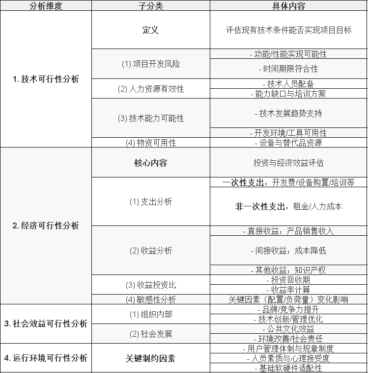 「可行性分析」在系统集成项目管理中扮演着项目"守门员"的关键角色,其本质是通过系统化研究回答三个核心问题:技术是否可实现?经济是否合理?操作是否可持续?根据PMBOK和系统集成项目管理工程师考试大纲,可行性分析可分为初步可行性分析(预可行性研究)和详细可行性分析两个递进阶段。最后的结果是得到可行性研究报告,供项目评估与决策。