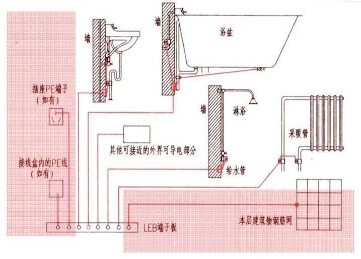 (3)浴室内的等电位联结不得与浴室外的PE线相连,以防故障时引入危险电位。如浴室内有PE线,则必须要与该PE线做联结(例如插座线的PE端子或接线盒内的PE线);