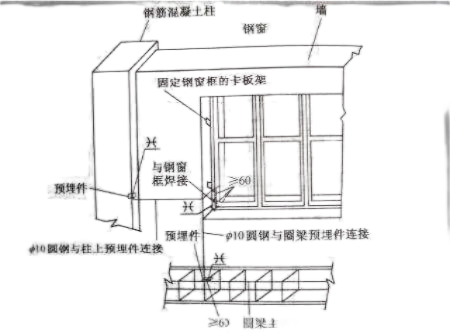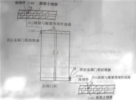 等电位联结线与金属窗的连接(如示意图):采用25㎜×4㎜的镀锌扁钢或φ10的圆钢,一端与圈梁预埋件焊接牢固,另一端与固定金属窗框的金属板焊接,也可通过搭接板(100㎜x30㎜x3㎜的镀锌扁钢)与固定门框上的预埋铁板连接,连接点不少于两处。